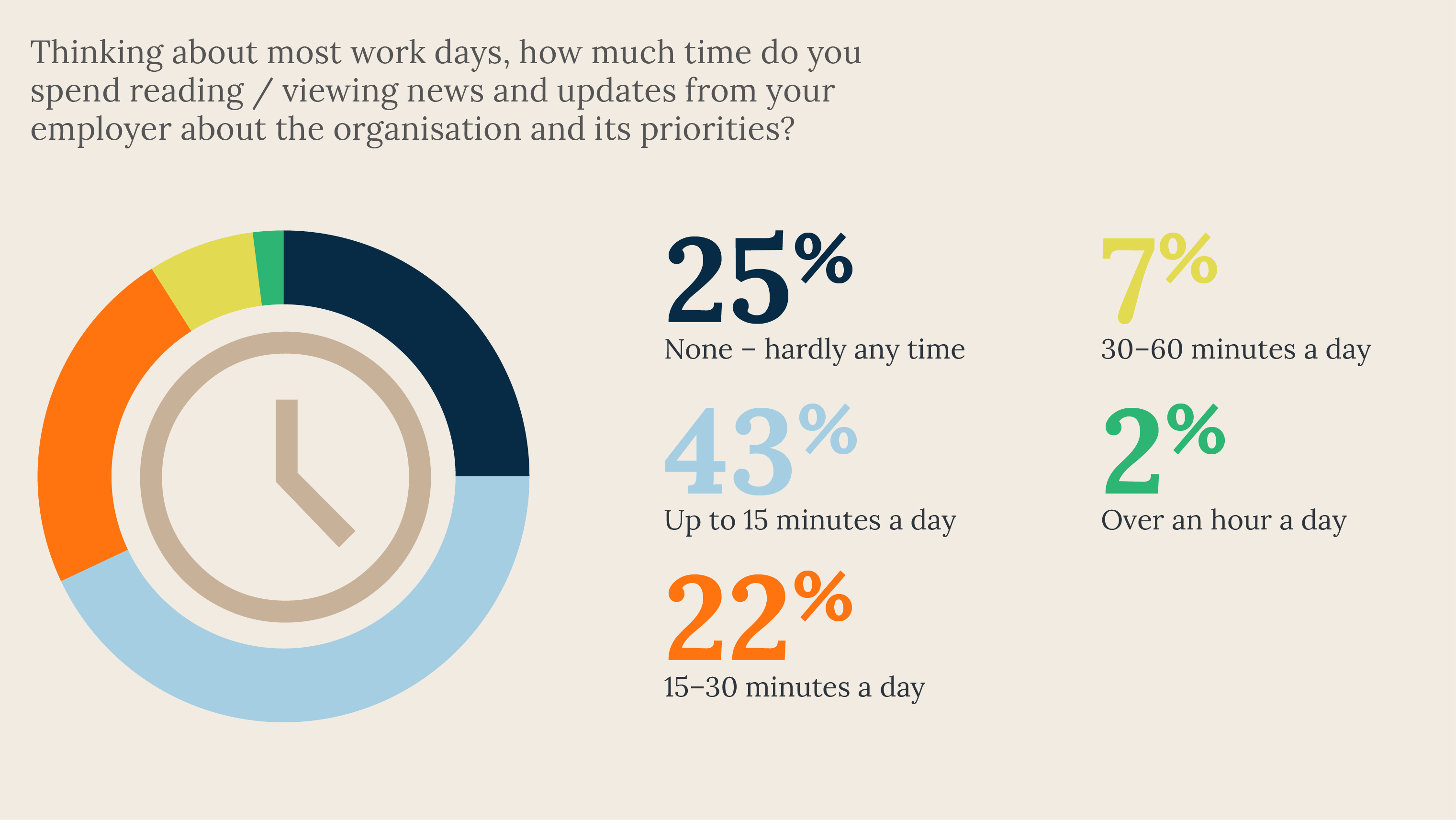 Indeed, 2024 internal communications research conducted by Ipsos Karian and Box, undertaken in conjunction with the Institute of Internal Communications, (see below) showed that employees spend no more than 15 minutes across a whole day reading or viewing internal communications from their employer.
